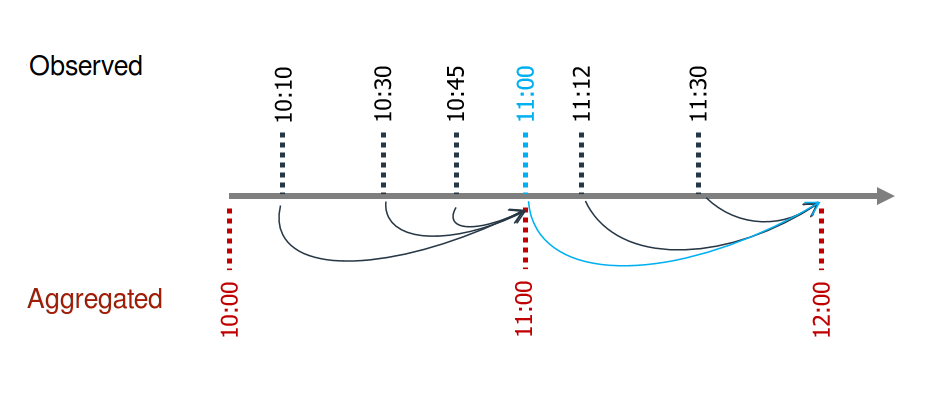 Supóngase ahora que, para poder tener suficiente margen de acción, a las 11:00 horas de cada día se tienen que generar las predicciones del día siguiente. Es decir, a las 11:00 del dia $D$ se tienen que predecir las horas [12, 13, 14, 15, 16, 17, 18, 19, 20, 21, 22, 23] de ese mismo día, y las horas [0, 1, 2, 3, 4, 5, 6, 7, 8, 9, 10, 11, 12, 13, 14, 15, 16, 17, 18, 19, 20, 21, 22, 23] del día $D+1$. Esto implica que se tienen que predecir un total de 36 horas a futuro aunque solo se almacenen las 24 últimas.