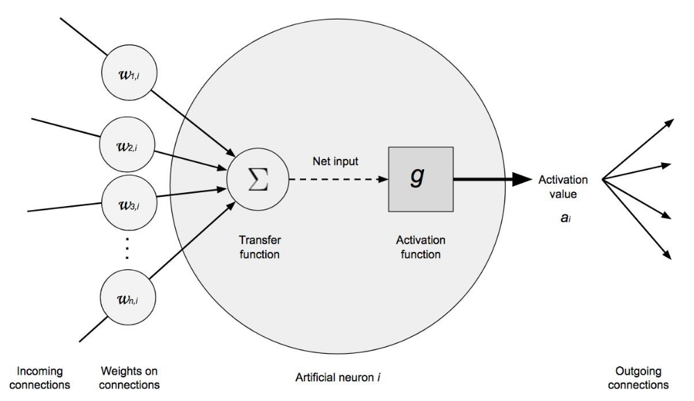 En la primera parte, se multiplica cada valor de entrada $x_i$ por su peso asociado $w_i$ y se suman junto con el bías. Este es el valor neto de entrada a la neurona. A continuación, este valor se pasa por una función, conocida como función de activación, que transforma el valor neto de entrada en un valor de salida.