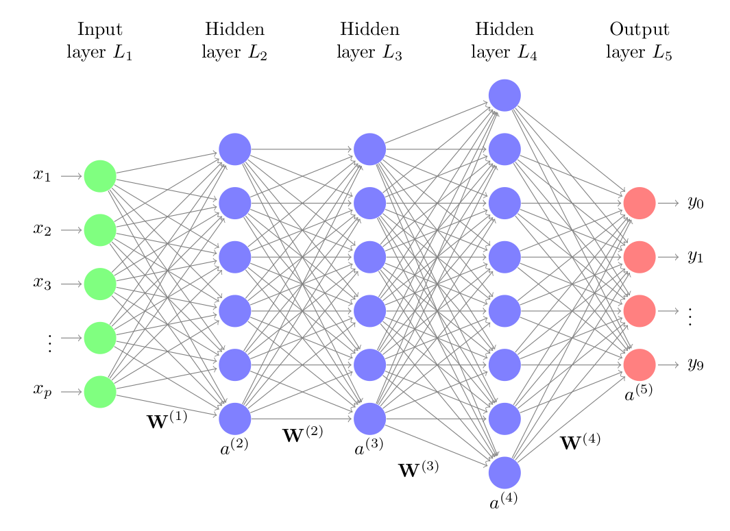 El modelo de red neuronal con una única capa (single-layer perceptron), aunque supuso un gran avance en el campo del machine learning, solo es capaz de aprender patrones sencillos. Para superar esta limitación, los investigadores descubrieron que, combinando múltiples capas ocultas, la red puede aprender relaciones mucho más complejas entre los predictores y la variable respuesta. A esta estructura se le conoce como perceptrón multicapa o multilayer perceptron (MLP), y puede considerarse como el primer modelo de deep learning.