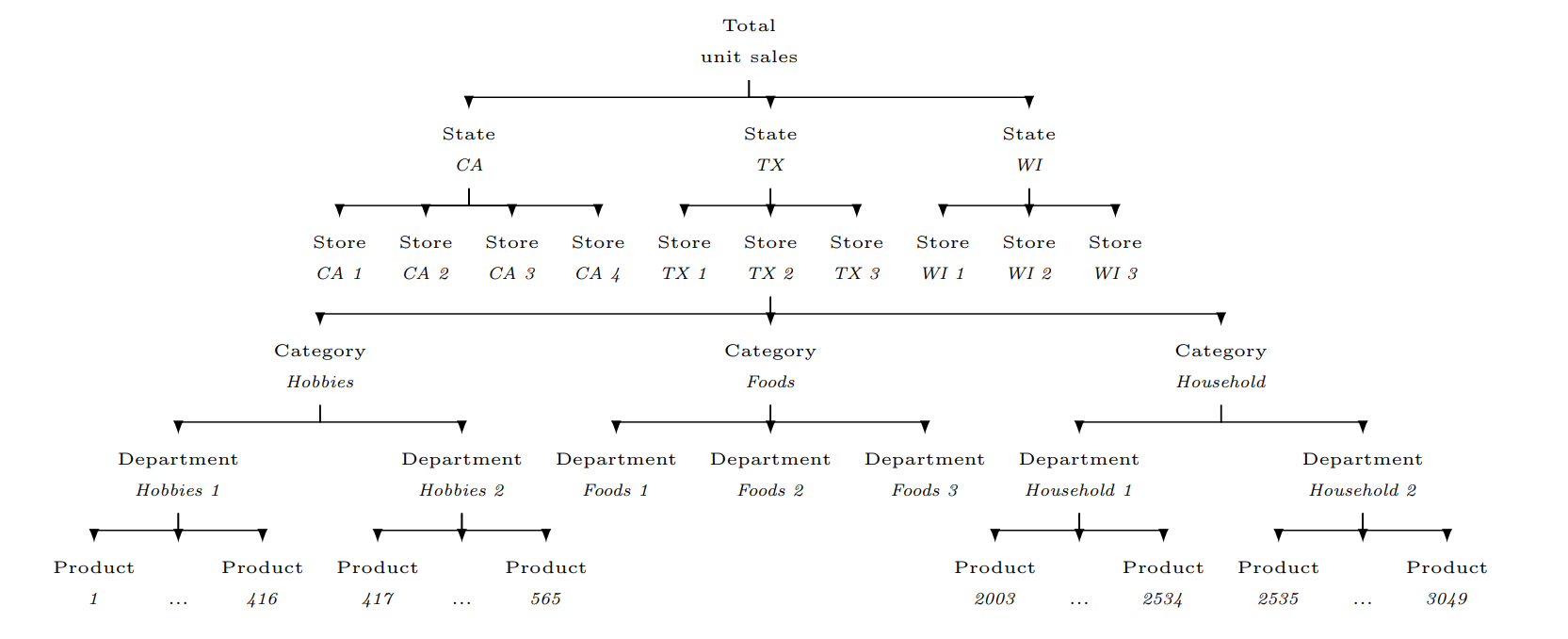 The M5 Accuracy competition dataset involves the unit sales of 3,049 products, classified in 3 product categories (Hobbies, Foods, and Household), and 7 product departments in which the above-mentioned categories are disaggregated. The products are sold across 10 stores, located in 3 States (CA, TX, and WI). The competition’s objective was to produce the most accurate point forecasts for 42,840 time series that represent the hierarchical unit sales of the largest retail company in the world, Walmart.