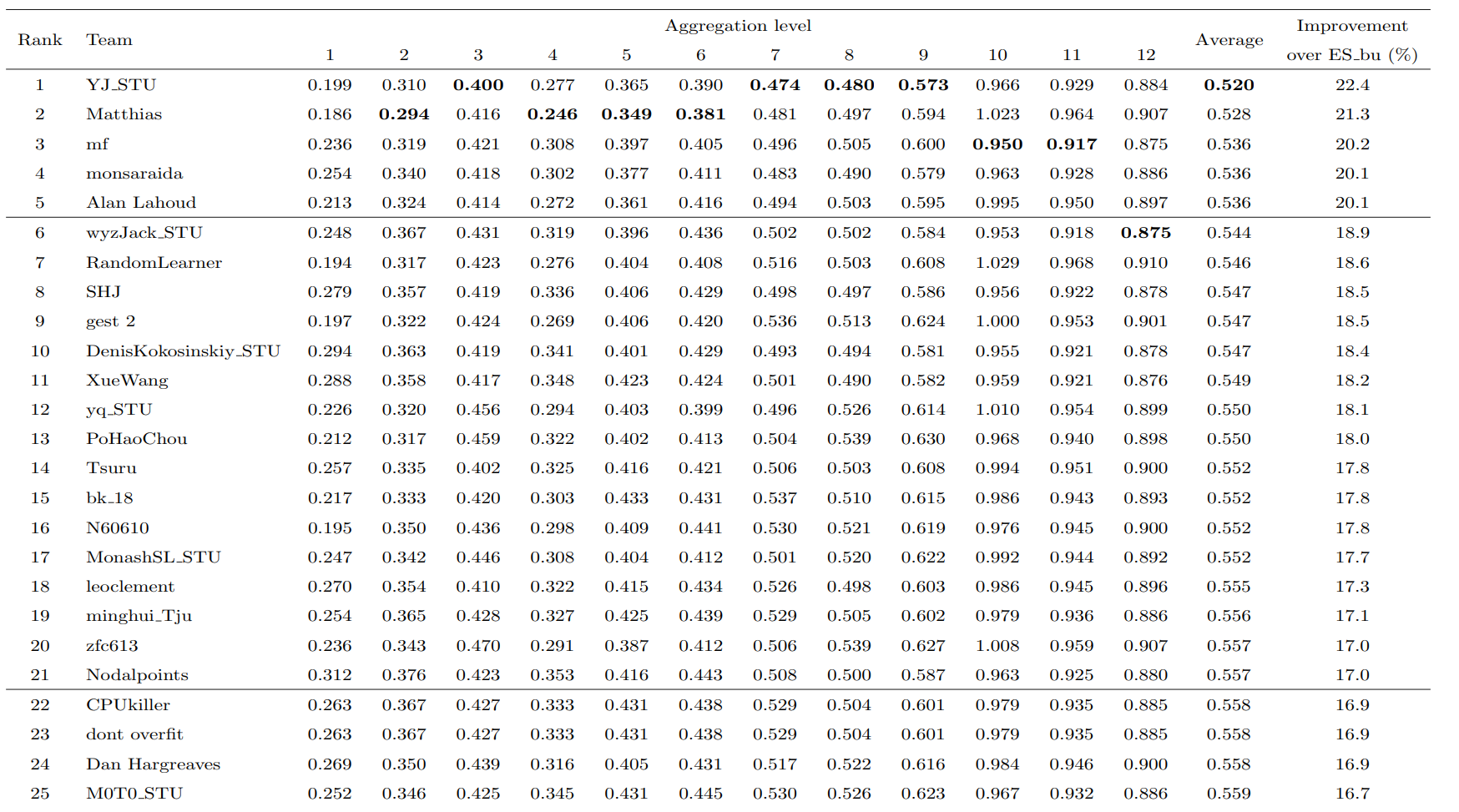 The performance of the top 25 teams of the M5 Accuracy competition in terms of WRMSSE. The results are presented both per aggregation level and overall. Overall percentage improvements are also reported in comparison to the top-performing benchmark (ES bu)