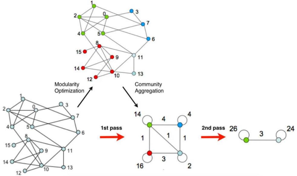 Algoritmo de Louvain: este algoritmo se basa en la idea de optimizar la métrica de modularidad, que busca maximizar el número de enlaces dentro de una comunidad y minimizar el número de enlaces entre comunidades. El concepto de la modularidad se explicará en detalle más adelante.