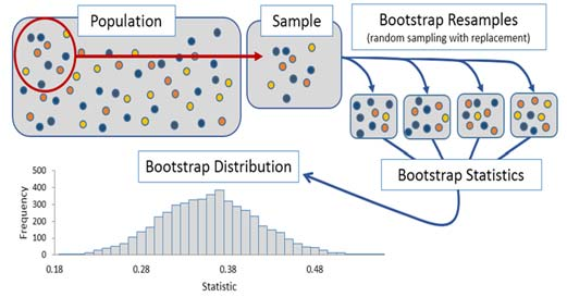 • bootstrapping simula el proceso de muestreo y con ello la variabilidad generada por este proceso. Gracias a esto, permite estimar la incertidumbre que se puede esperar de un estadístico calculado a partir de una muestra.